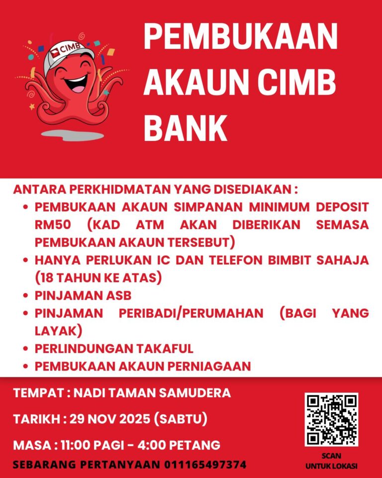 KAUNTER PERKHIDMATAN CIMB — MINI PROGRAM NADI & KOMUNITI 2025 Terima kasih kepada pihak CIMB yang turut serta membuka kaunter perkhidmatan khas semasa program! Kaunter ini berjaya membantu komuniti membuat: Pembukaan akaun persendirian Pembukaan akaun syarikat (SSM) Hampir 23 orang […]